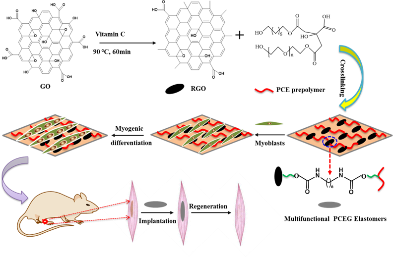 该研究成果已于近期在线发表于期刊Biomaterials (影响因子8.4)上,题为“Biomimetic elastomeric, conductive and biodegradable polycitratebased nanocomposites for guiding myogenic differentiation and skeletal muscle regeneration”。bwin博士生杜玉章和葛娟为该论文的第一作者,bwin为该论文的第一作者单位和唯一通讯作者单位。