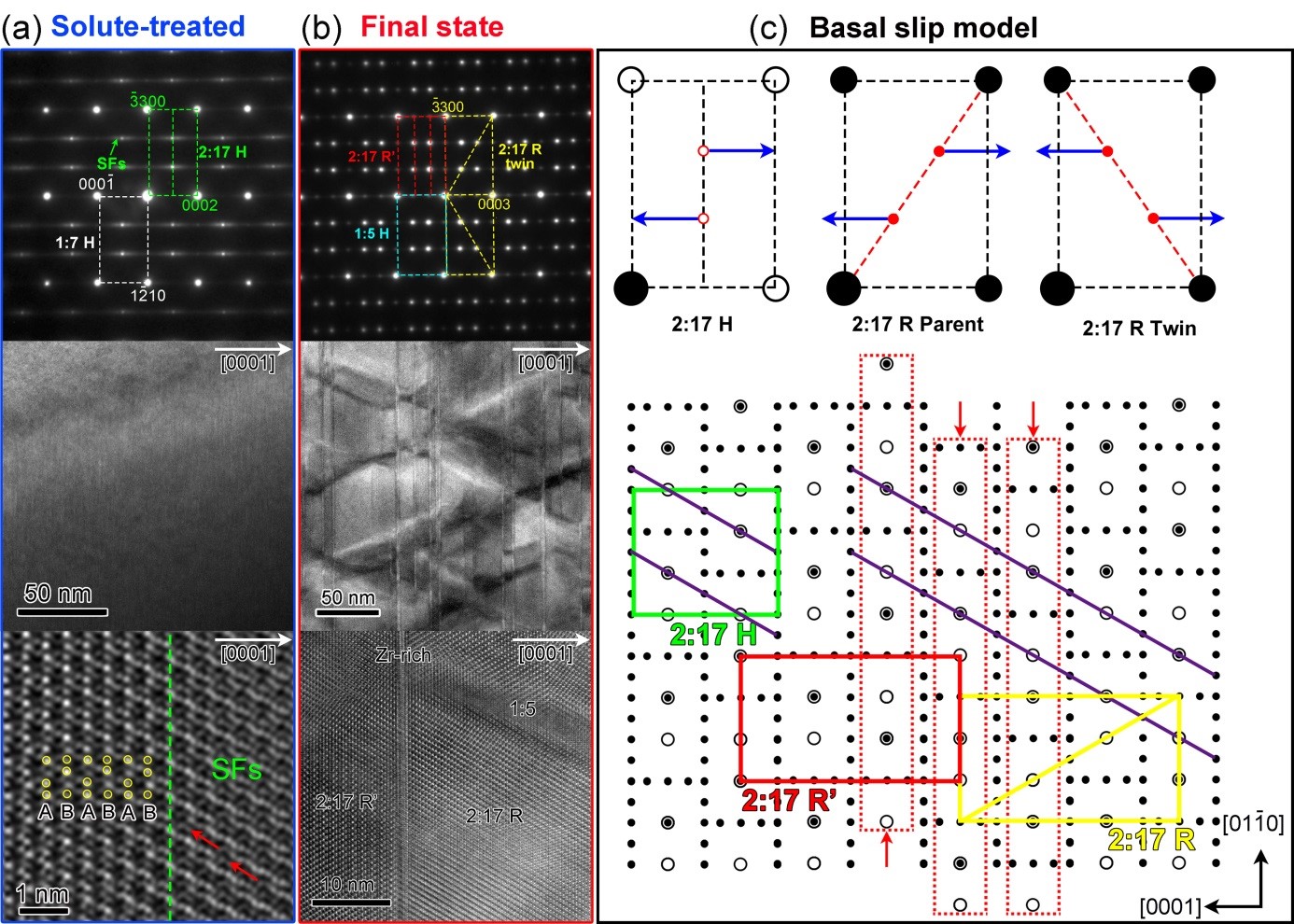他们进一步结合球差电镜和元素分析,观察到由于位错不完全迁移和元素不充分扩散所形成的2:17R’中间相(图2)。根据实验结果,他们提出了基面滑移原子模型(图1c)来解释该体系的缺陷形成及分解过程。该工作表明2:17型Sm-Co-Fe-Cu-Zr合金形成纳米胞状组织为扩散-位移型混合相变机制,不仅澄清了该材料的长期争议,也将为调控再结晶与析出共生合金体系的微观组织提供重要理论参考。